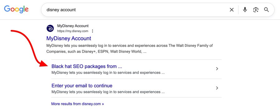 Disney.com, yes! The kingdom of Mickey Mouse briefly surfaced in Google with the headline: “Buy Black Hat SEO Packages – My Disney.”