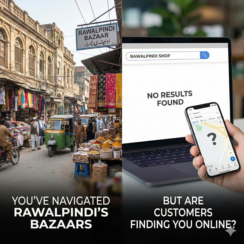 Rawalpindi's commercial heart beats in Saddar's crowded streets, Raja Bazaar's bustling lanes, and Commercial Market's wholesale density. Physical foot traffic still drives business. But here's what's changing: customers research online before visiting. They Google "best [product] Rawalpindi" while sitting in Saddar, comparing options before walking three shops down. If you're not ranking when they search, you're invisible, even if your shop is 50 meters from where they're standing.